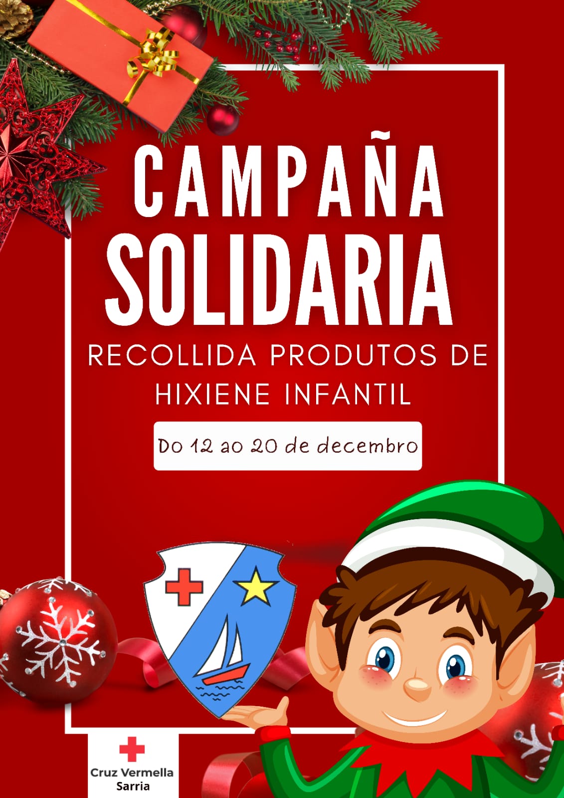 Queridas familias: Achégase unha das datas máis especiais do ano. Como cada Nadal, o noso cole organiza unha "Campaña solidaria", este ano en colaboración coa Cruz Vermella de Sarria na procura de kits de hixiene infantil para axudar aos máis necesitados. Poderedes traer a vosa aportación á Secretaría do Centro ata o mércores, 20 de decembro. Unidos podemos conseguir máis. Animádevos a participar! Moitas grazas de antemán!!!
